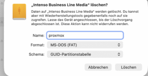Der Mini PC soll mit PROXMOX laufen. Dadurch sollten sich einige Vereinfachungen -wie die Backup und Test Strategie- realisieren lassen. Zum flashen des Geräts wird ein USB-A Stick benötigt, von dem gebootet werden kann. Am Mac habe ich es so gemacht: