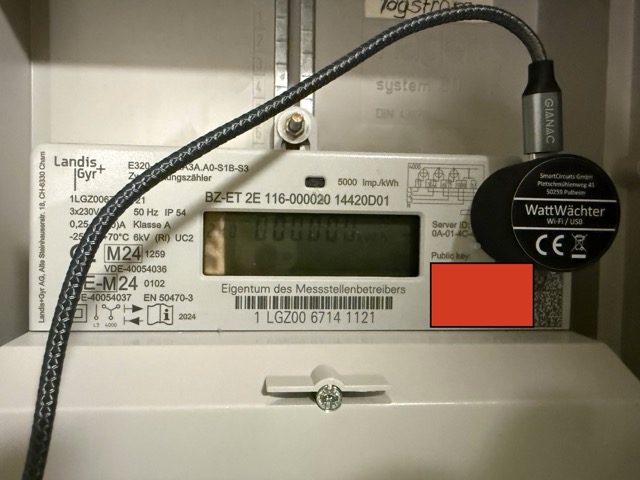 Dann kam die Idee auf, Messungen über einen WattWächter zu realisieren. Der WattWächter (ich werde ihn mit WW künftig abkürzen) sitzt auf dem Stromzähler und kann über die optische Schnittstelle Daten empfangen. Senden und empfangen erfolgt über ein WLAN Modul. Kaufen kann man den WW überall, sogar selber bauen. (WattWächter Wi-Fi/USB, IR Lesekopf für Stromzähler/SmartMeter/EHZ, Tasmota vorinstalliert, WLAN, Volkszähler) Wichtig für die Nutzung ist, dass der Stromzähler Landis + Gyr E320 eine optische Schnittstelle hat, die aber über einen PIN gesperrt ist. Den PIN (z.B. 9475) muss man sich über den Netzstellenbetreiber (bei mir LVN) telefonisch geben lassen.